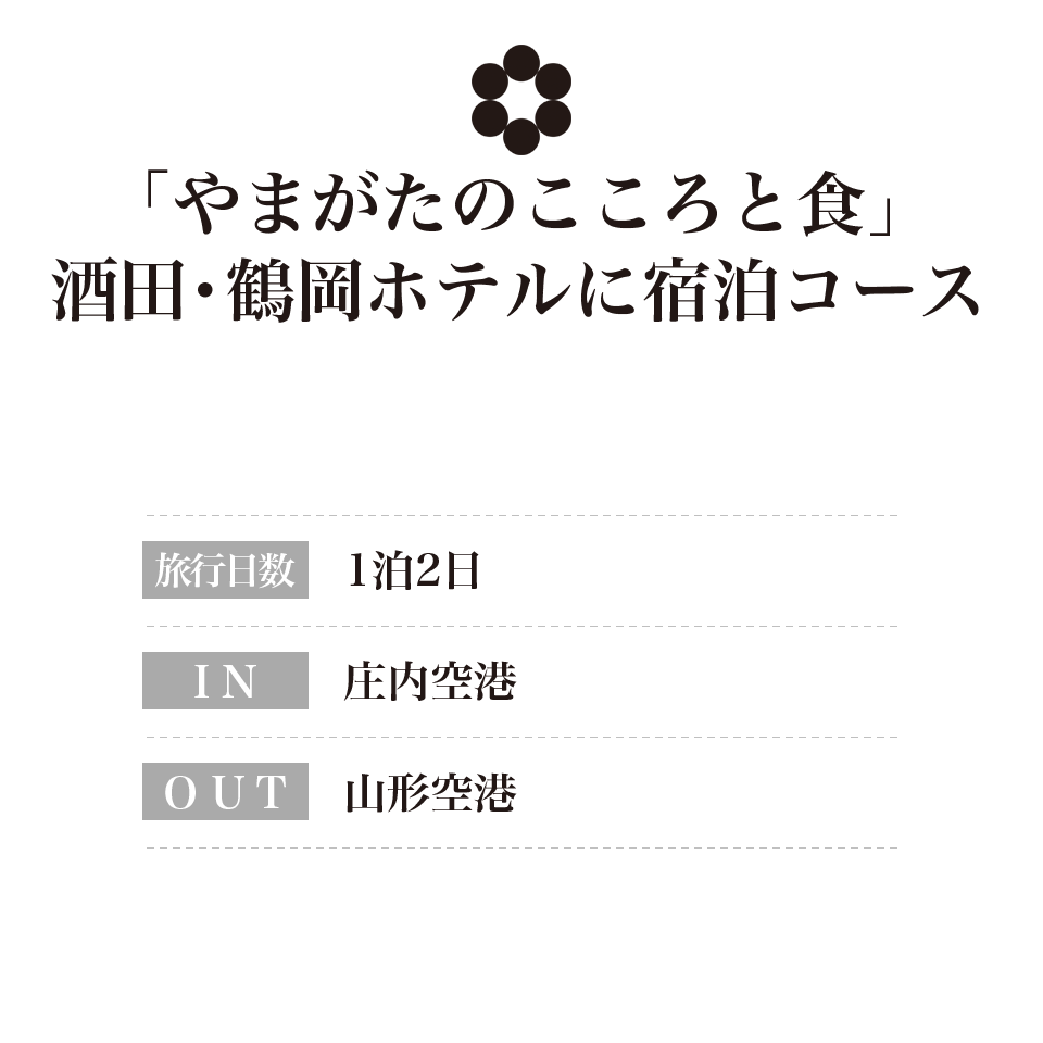 — コース詳細 — PDFダウンロード — 見どころ — ③松ヶ岡開墾場明治維新後、庄内藩士たちが拓いた緑豊かな大地として、国指定史跡として指定を受けています。 ④玉川寺1987年に国の文化財名勝に指定された玉川寺庭園は、全国でも珍しい九輪草の純群落など、さまざまな花が咲くことから「花の寺」と呼ばれています。 ⑤羽黒山五重塔東北地方では最古の塔といわれ、平将門の創建と伝えられています。昭和41年には国宝に指定され、近くには樹齢1,000年、樹の周囲10mの巨杉“爺杉”があります。 ⑥三神合祭殿月山・羽黒山・湯殿山の三神を合祭した日本随一の大社殿。前方の鏡池は、神秘の御池として古来より多くの信仰を集め、羽黒信仰の中心でもありました。“生まれ変わり”の聖地であり、全国でも屈指のパワースポットとなっています。 ⑨湯殿山神社古来から出羽三山の奥の院とされ、写真撮影禁止・土足厳禁が今も守られ、御神体は熱湯の湧き出る茶褐色の巨大な岩。 ⑩慈恩寺天平18年(746)の開山と伝えられ、東北随一の巨刹として栄えました。三重塔、重要文化財指定「十二神将」など、平泉中尊寺に匹敵するとされています。 ⑫若松寺室町時代には観音巡礼信仰が東国にも普及し、最上三十三観音札所の第一番に位置づけられています。「縁結び」観音として有名です。 ⑬立石寺貞観2年(860)慈覚大師によって開かれました。全山が老杉に覆われた奇岩でできており、この地を訪れた松尾芭蕉が詠んだ「閑さや 岩にしみ入 蟬の聲」の名句はあまりに有名です。悪縁切り寺として知られています。