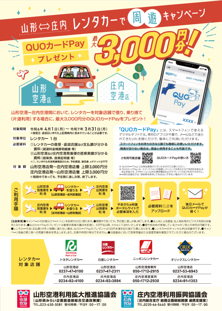 山形空港↔庄内空港レンタカー周遊キャンペーン実施中🚙
